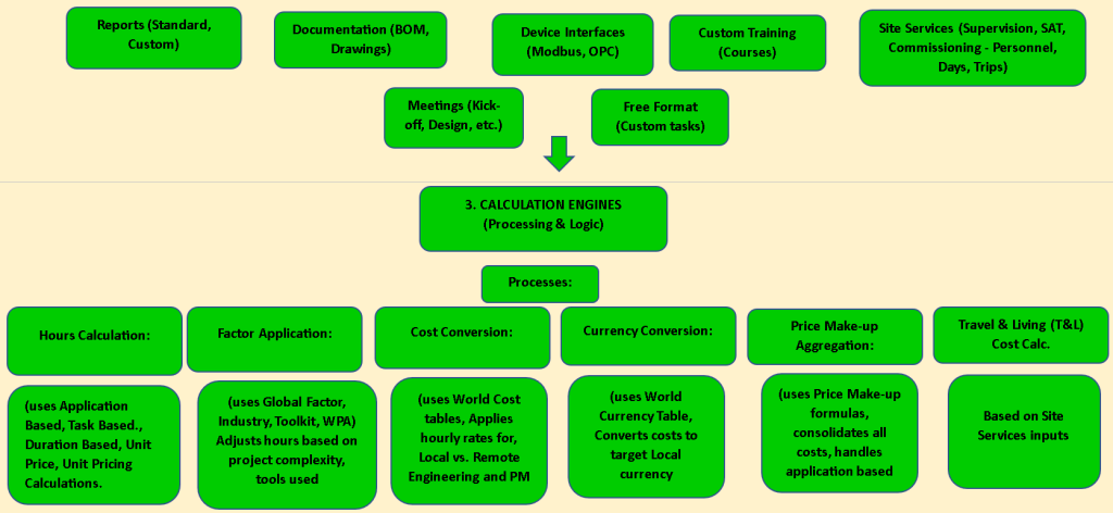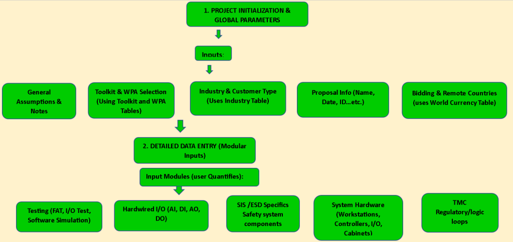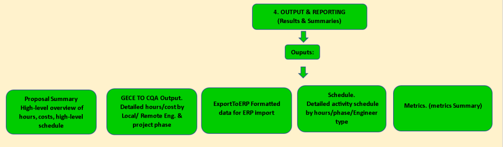 This diagram shows the full estimation workflow of the GECE Tool — from inputs to processing to outputs.